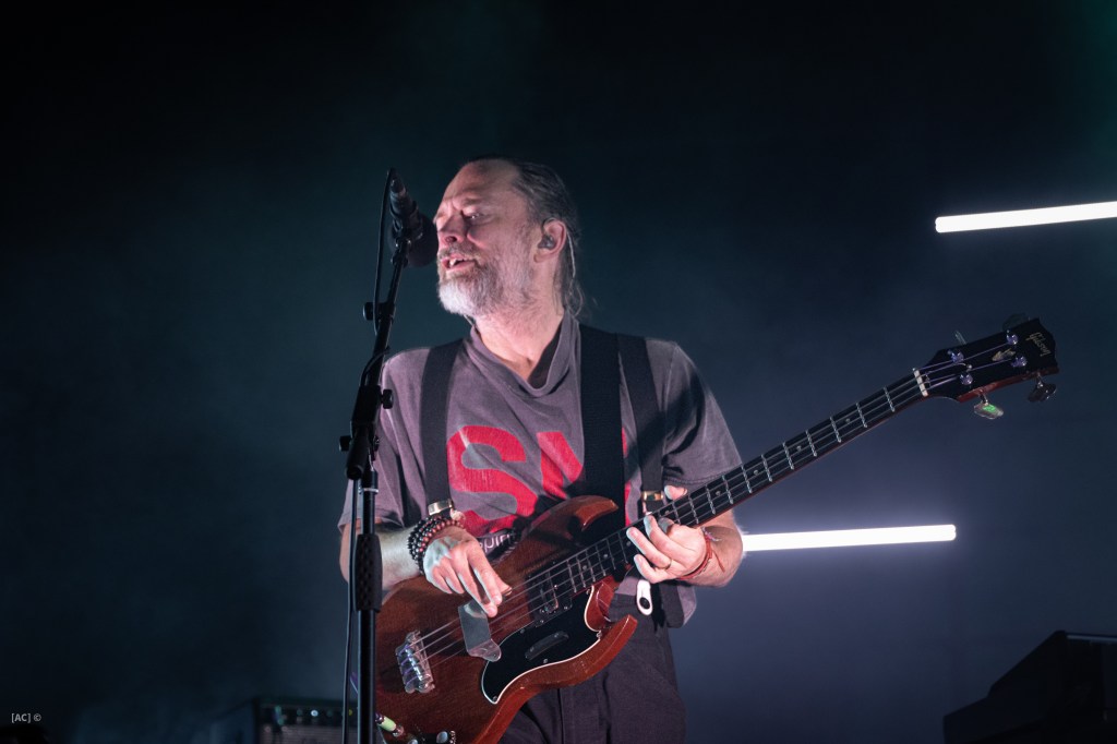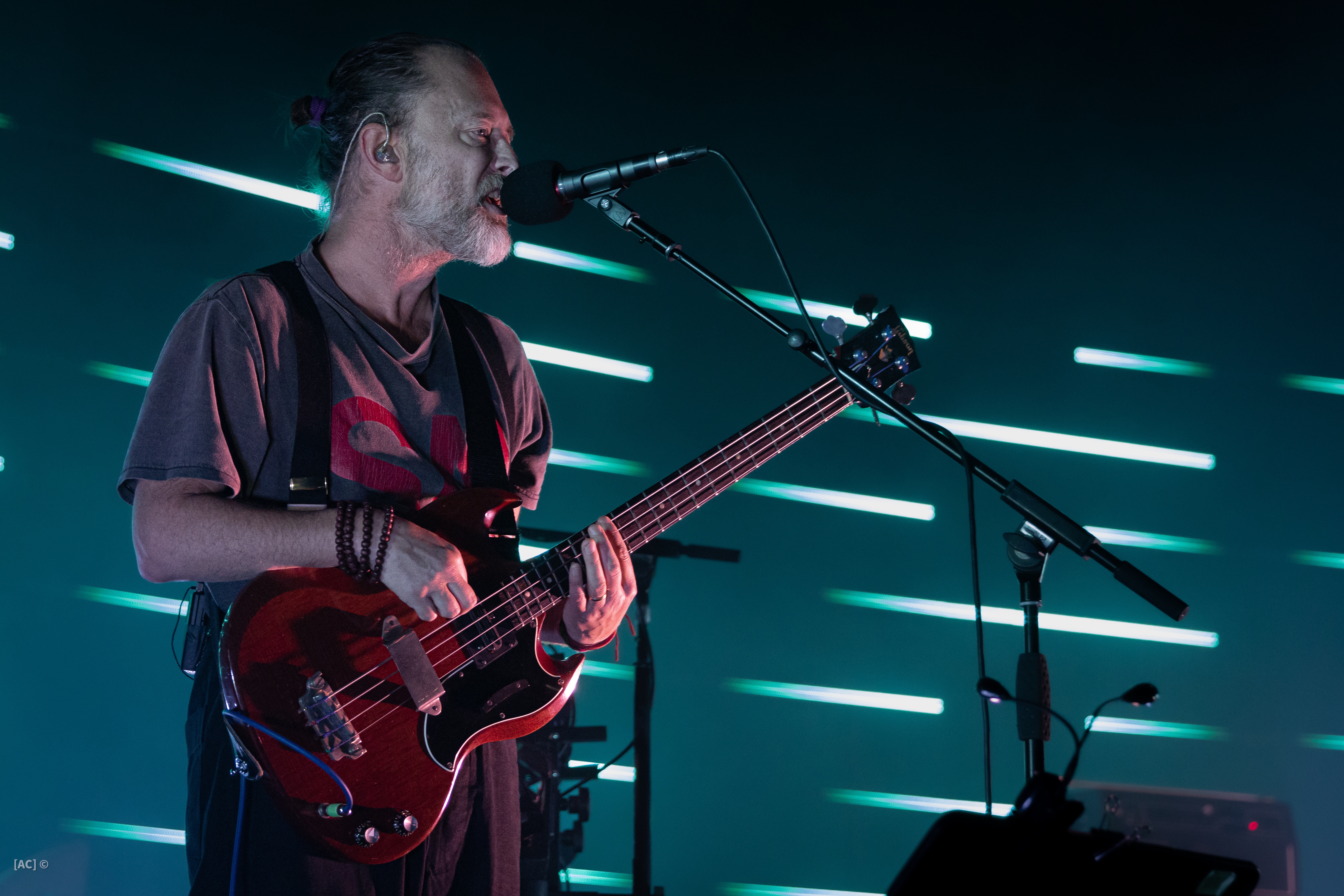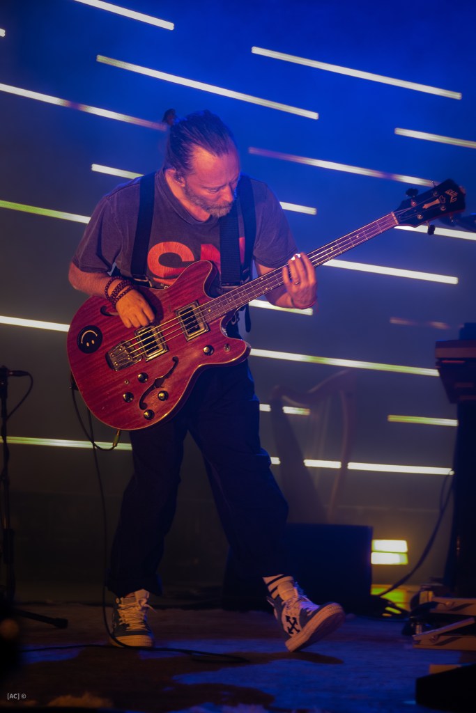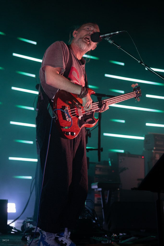 The band deliver all of their material tonight in a sprawling set that ebbs and flows and see’s Yorke switch between piano, keyboards bass and guitars whilst Greenwood alternates between synthesisers and guitar, with a harp thrown in for good measure and what we’ve become to expect from the award winning composer. He looks reinvigorated here, like he’s almost missed rhythmic riffs and moments of soloing with his signature swinging hairdo covering his face for the majority of the show. Skinner has some genuine stand out moments with his drumming prowess, adding a new dynamic to Yorke and Greenwood’s claustrophobic ambient sounds. The musicianship is so admirable. These guys have been there and done it all, yet continue to challenge and push themselves into the unknown.