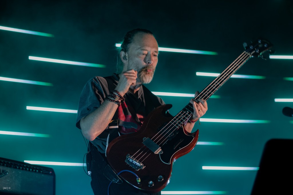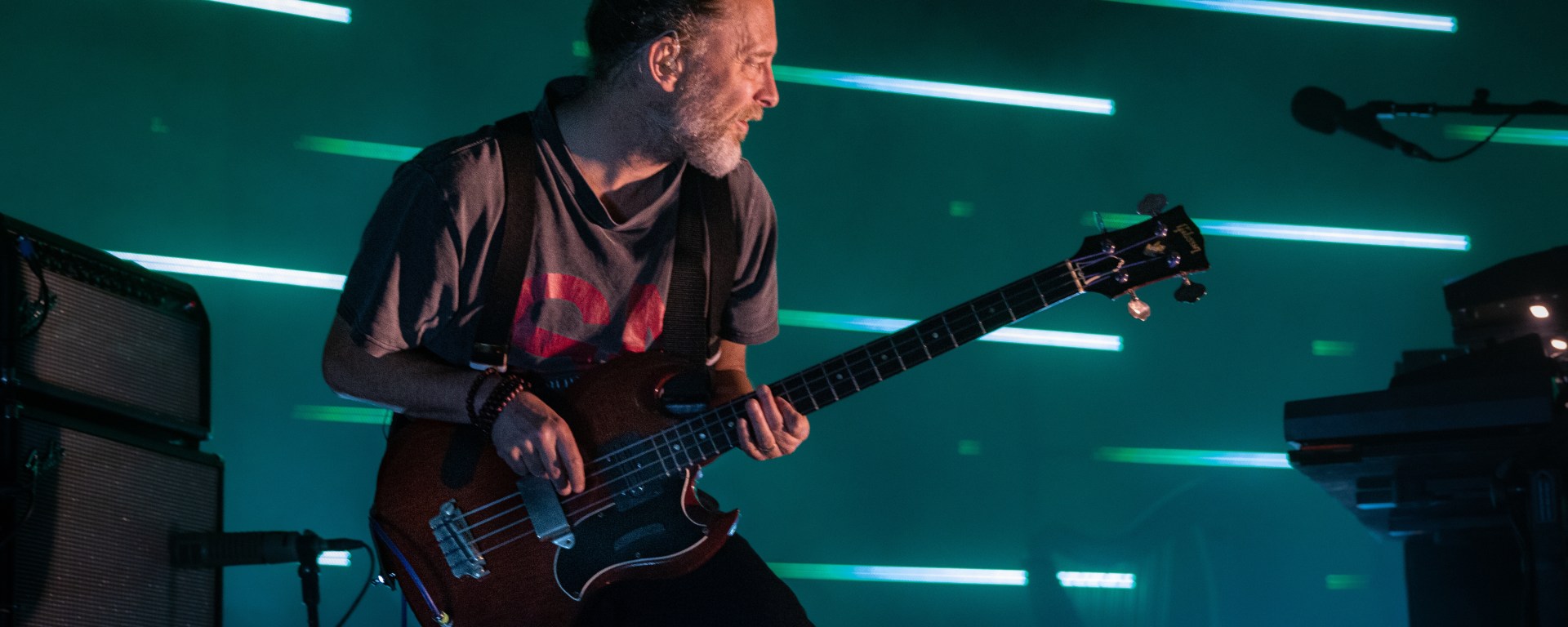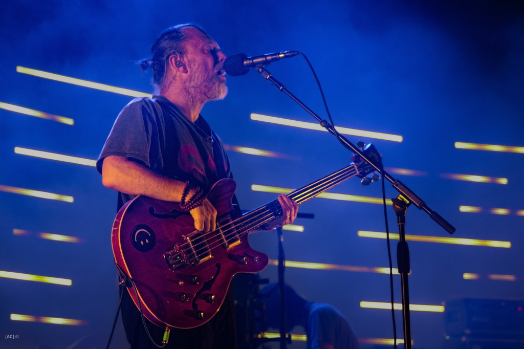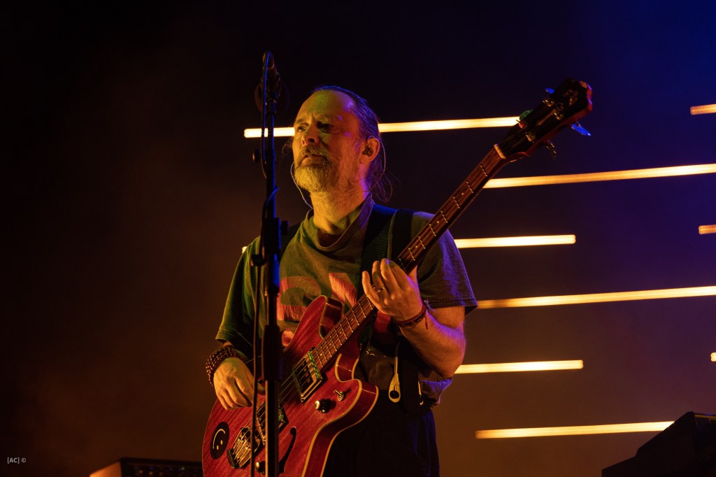 The band deliver all of their material tonight in a sprawling set that ebbs and flows and see’s Yorke switch between piano, keyboards bass and guitars whilst Greenwood alternates between synthesisers and guitar, with a harp thrown in for good measure and what we’ve become to expect from the award winning composer. He looks reinvigorated here, like he’s almost missed rhythmic riffs and moments of soloing with his signature swinging hairdo covering his face for the majority of the show. Skinner has some genuine stand out moments with his drumming prowess, adding a new dynamic to Yorke and Greenwood’s claustrophobic ambient sounds. The musicianship is so admirable. These guys have been there and done it all, yet continue to challenge and push themselves into the unknown.