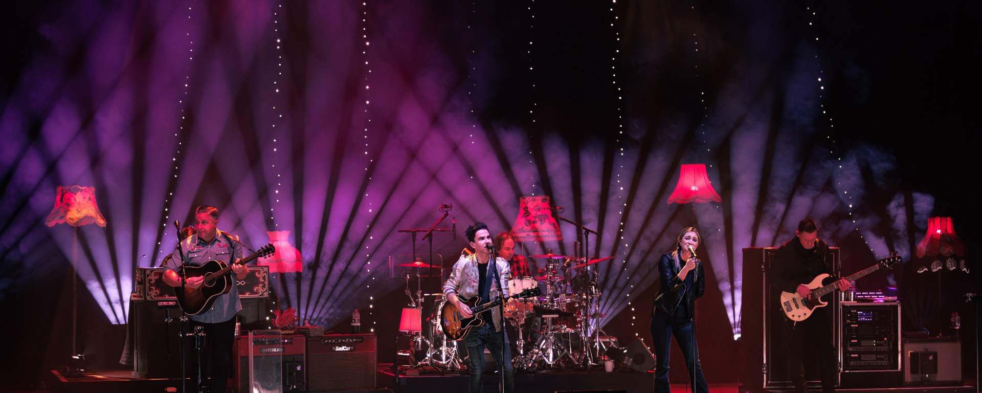 The last (and first) time we saw the band they were performing under the Kings of Leon and as such were at the whim of the headline acts stage design and production. Tonight we get to see the stage style of Far From Saints for the first time and it turns out to be quite charming. Rugs and lamps adorn the stage and an impressive set of fairy lights (think more Trafalgar Square rather than your own front room Christmas tree) are draped from the ceiling and down behind the band in a image that is a little reminiscent of the inside of a circus tent.