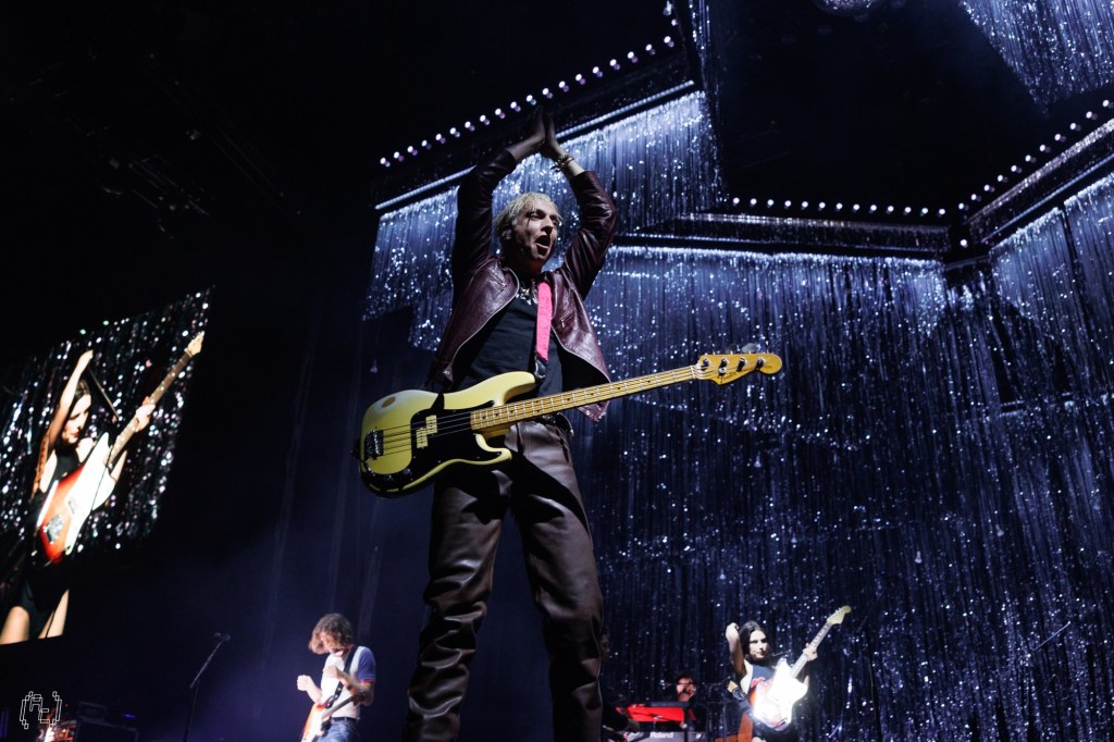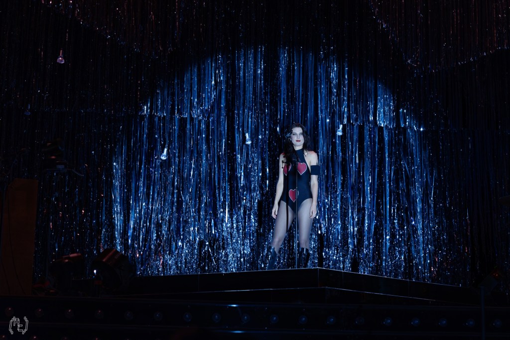 It felt mischievous from the start. “Thorns” opened proceedings with that slow-burn tension, guitars coiling before they strike. Live, the track felt sharper than on record, its barbed edges amplified by the theatrical set. The star glowed cold and white, the tinsel catching every flicker of light so that the whole stage shimmered as if it might levitate.